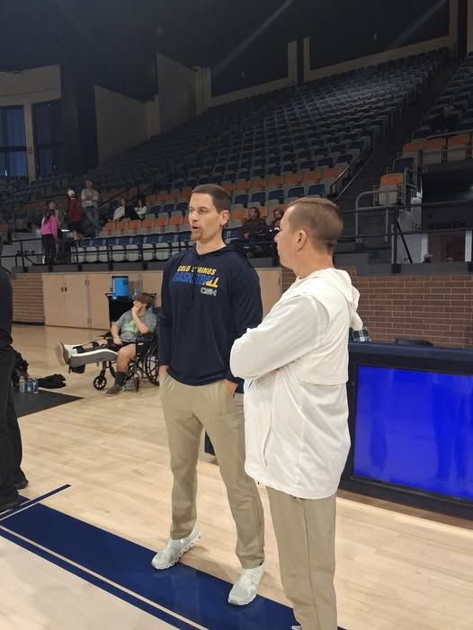 Photo of Cold Springs' coach Drew Adams (left) and Casey Fox of Marion County Saturday before their game at Wallace State's Tom Drake Coliseum.