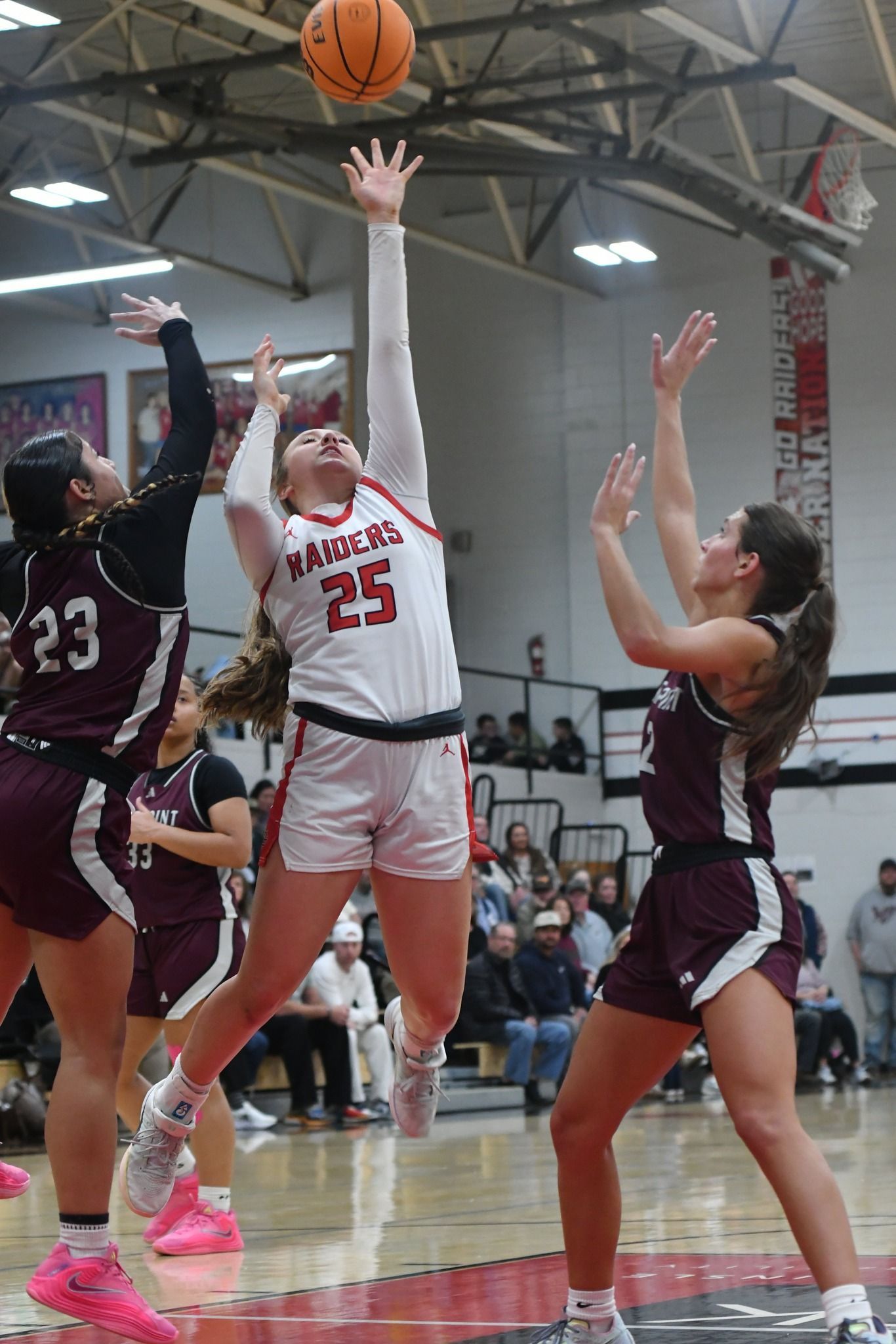 Photo of Good Hope SF Ella Davis shooting between West Point's Jaelyn Faulkner (23) and Caitlee Simmons (2) in a game at Good Hope Gymnasium December 22.
