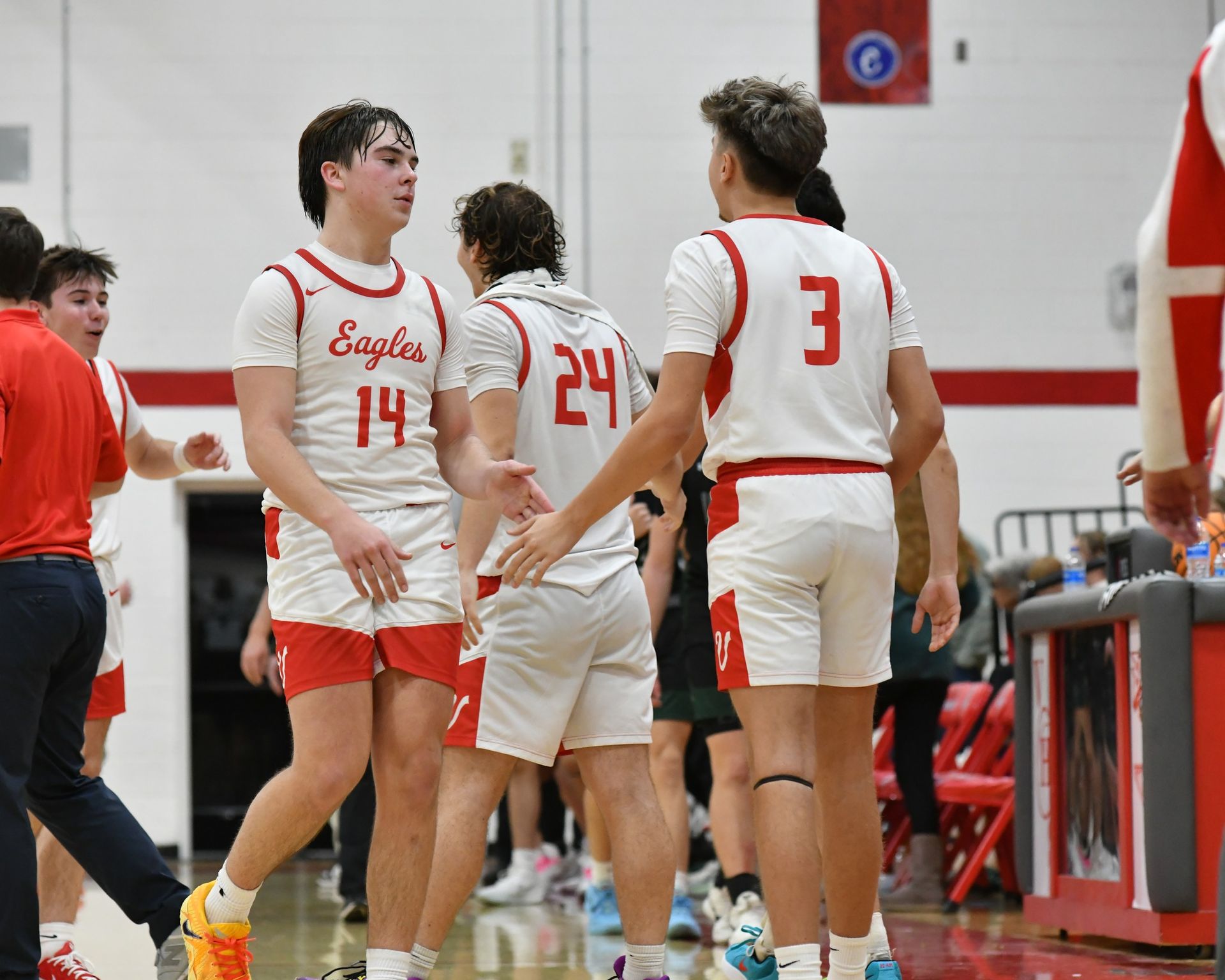 Photo of Vinemont Eagles Cheston Wilhite (14), Banks Borwick (3) and Colton Gillis (24) celebrating a 69 to 64 victory at Vinemont on December 9 vs. Locust Fork.