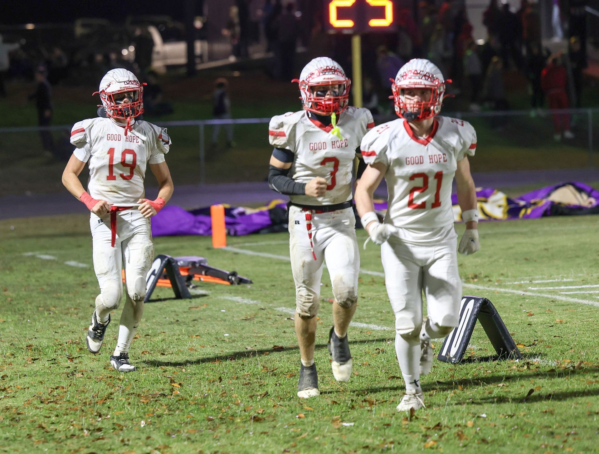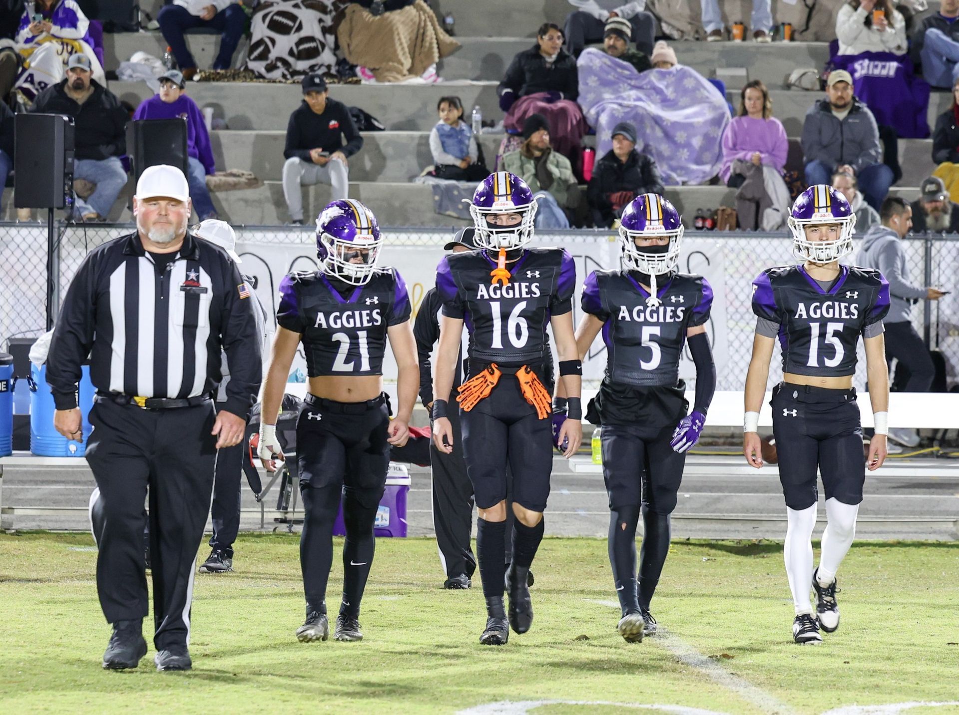 Photo of Fairview captains Jace Stephens (21), Zayden Cruce (16), Connor Scott (5) and Kolt Redding in pregame vs. Good Hope on October 30.