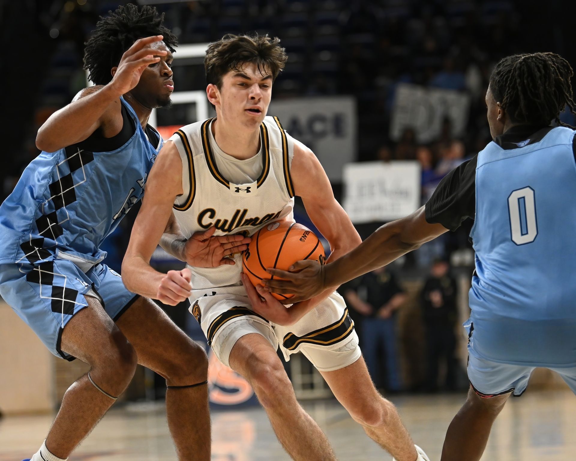 Photo of Cullman Bearcats' Sam Dorough going up against Lee Huntsville defenders in the Northwest Regional 6A championship from Wallace State CC February 24.