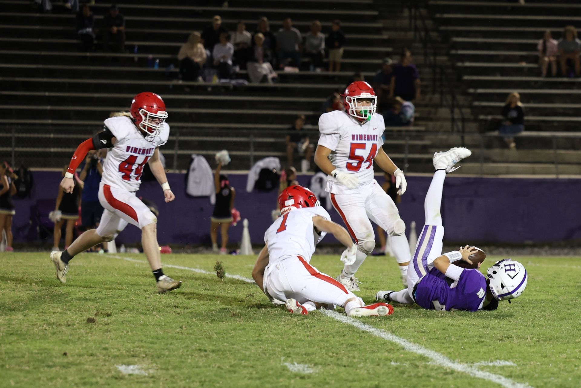 Photo of Vinemont defenders Travis Speer (7), Trent Mims (44) and Roman Romero (54) making a tackle in game at Hanceville October 3.
