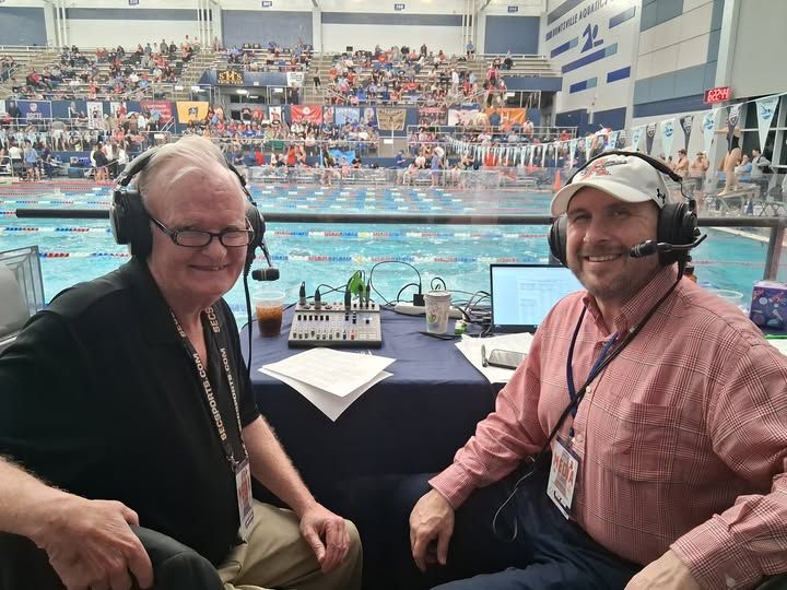 Photo of WKUL FM broadcasters Johnny "Flash" Thornton (left) and Rich Jesse in providing play by play and analysis for the NFHS Network Saturday at the AHSAA swimming championship from the Huntsville Aquatics Center.
