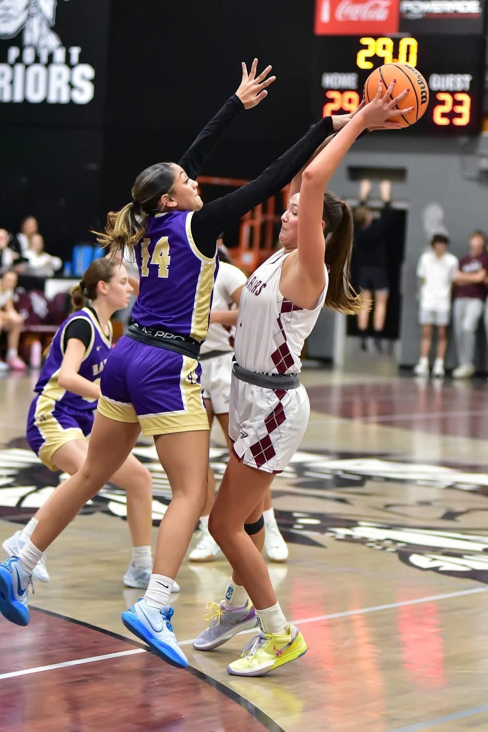 Photo of Vinemont's Caroline Miller (23) and Morgan Flanagan (5) defending against Laklin Shadix of West Point in the Cullman County semifinal January 23 from Wallace State.